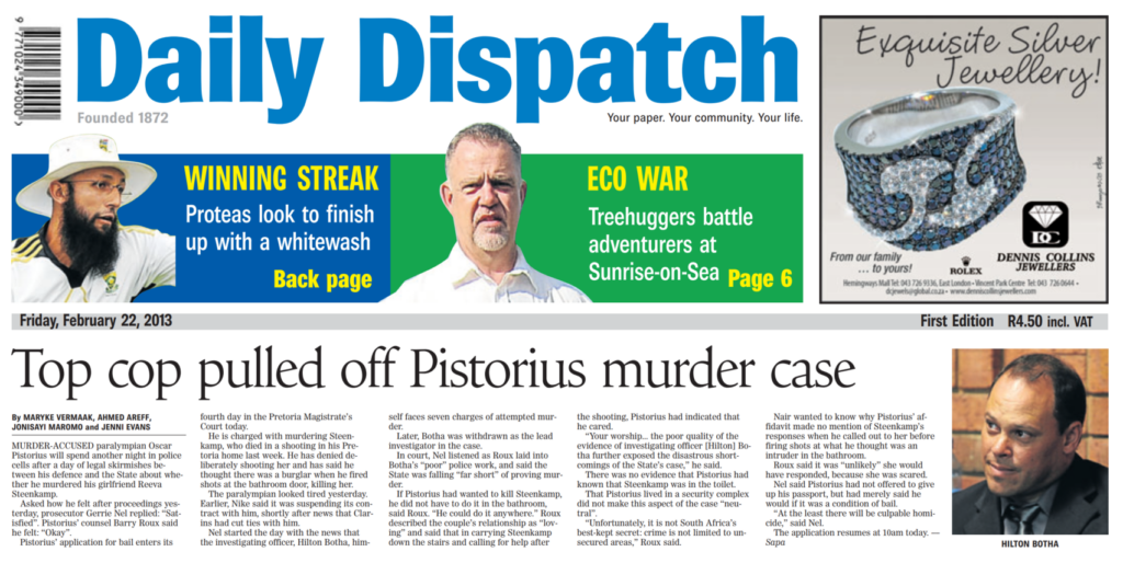 In an early indication of police contamination of the crime scene, at the end of the first day of the bail hearing, I noted that the Prosecution were intending to call Detective Hilton Botha, the investigating officer, to the stand the next day. I did a Google search for the name and found a New Age article from 2012 that detailed Botha’s arrest on seven charges of attempted murder. I alerted an Eyewitness News radio reporter and by the third day of the bail hearing, Botha was off the case.