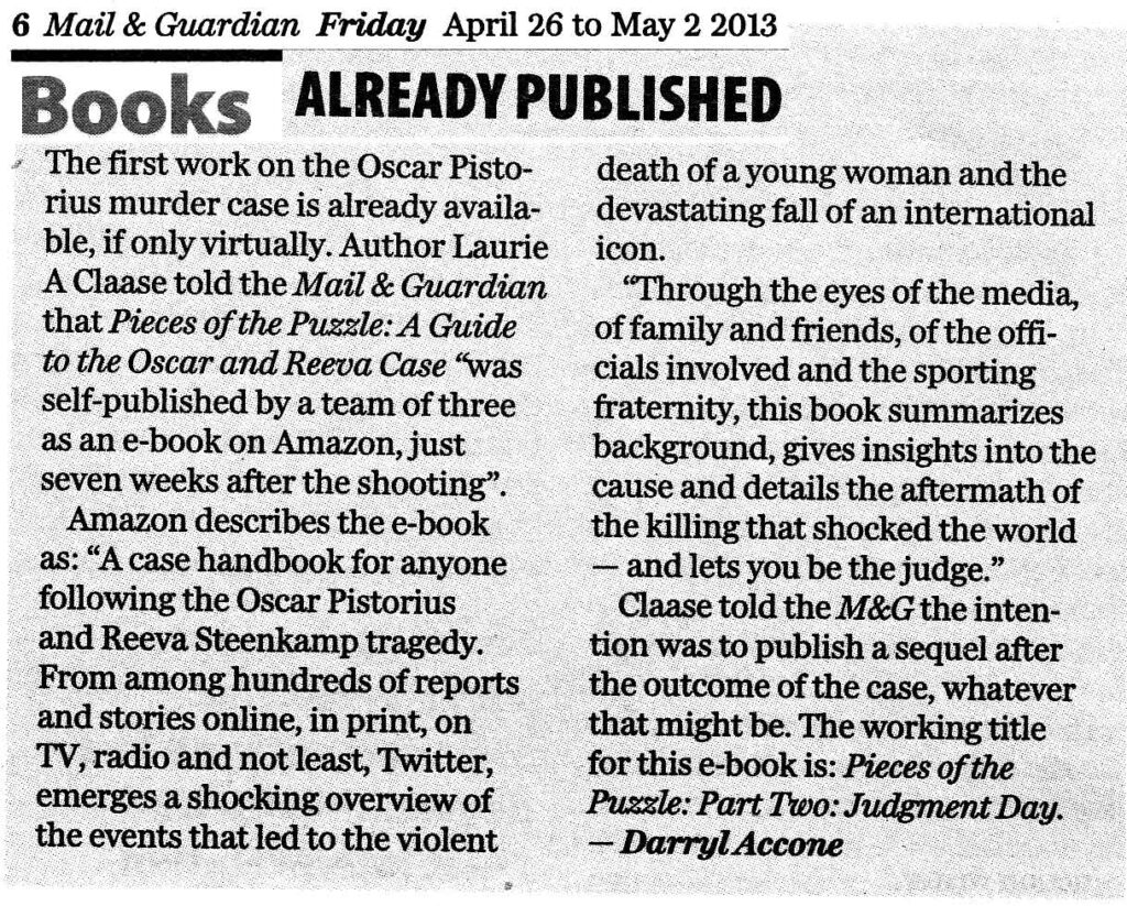 KDP | AMAZON: The first in a two-part Kindle series, 'Pieces of the Puzzle: The Killing' was the first book, globally, to be published on the biggest story to come out of South Africa since the release of Nelson Mandela. The 2013 Valentine's Day shooting in South Africa shocked the world. Twitter broke the news. Olympics and Paralympics hero, Oscar Pistorius had killed girlfriend, Reeva Steenkamp. Written in real time as events were unfolding, the e-book covers a seven-month period from the day of the shooting to the Blade Runner’s pre-trial appearance on 19 August 2013. Through the eyes of the media, of family and friends, of the authorities, the sporting fraternity and the protagonists themselves, this e-book introduces the role players, summarises the bail hearing evidence and illuminates the context of the tragedy. (ASIN: B00C4VLWIC)