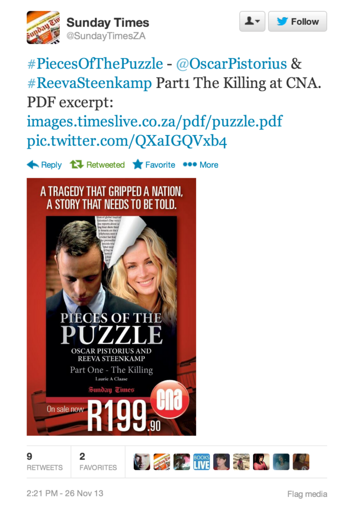 Thanks to a partnership with South Africa's foremost weekly newspaper the 'Sunday Times', which enabled access to their image archive, the print version of 'Pieces of the Puzzle: The Killing' assembles the evidence that would feature in Oscar Pistorius's murder trial and presents it through contemporary newspaper articles, photographs, cartoons and graphics. (ISBN: 978-1-920380-32-9)